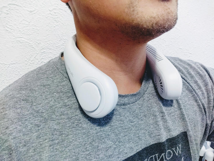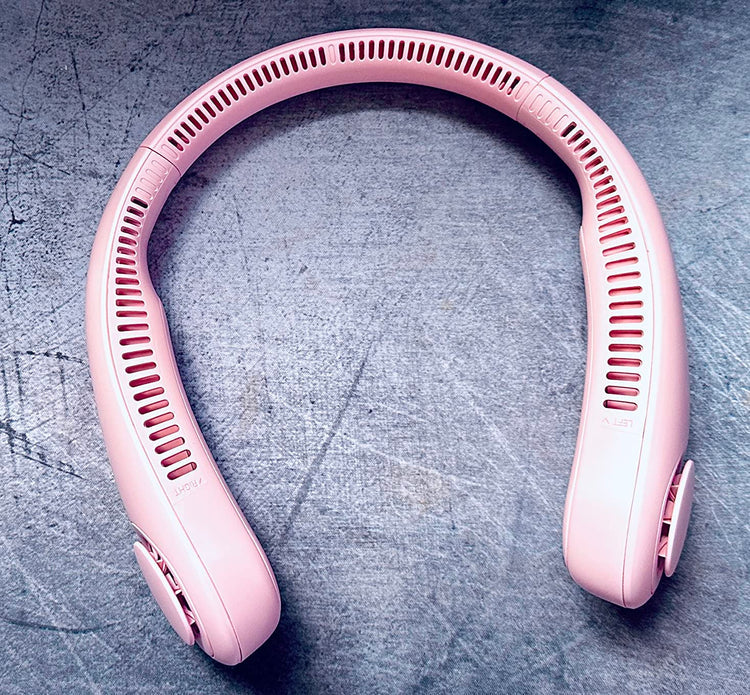 A novel neck fan that can send the wind without clogging your hands by simply placing it on your neck. Designed without wings, it can be used safely by children and the elderly.